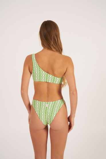 Top de Bikini Asimétrico con Estampado Geométrico en Crudo y Verde  Con un diseño asimétrico y una anilla dorada en el hombro. Este top de bikini tiene un estampado geométrico en color crudo y verde, acentuadas por...
