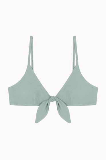 Top de Bikini con Lazo en Verde Kaki Claro Descubre el Mousse Top Lace. Un escote en uve terminado con el detalle del lazo en la parte delantera, con reguladores dorados en los tirantes para un ajuste perfecto. Su...