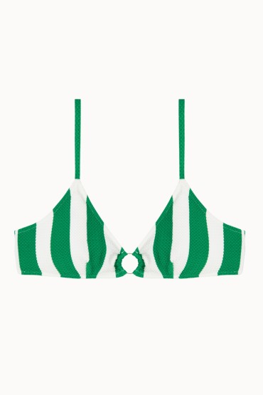 Top de Bikini con Escote y Anilla Dorada en Jaquard a Rayas Verdes y Blancas Diseñado para ofrecer una buena sujeción, con tirantes regulables y el cierre multiposición. Su anilla dorada en el escote combinada con el...