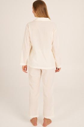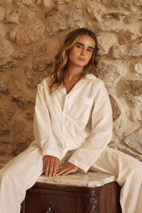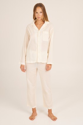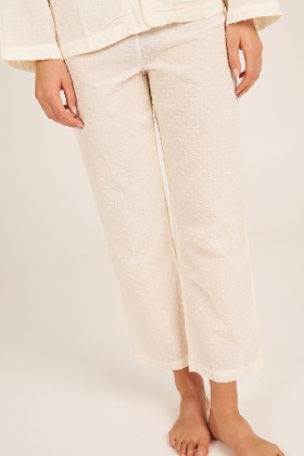 Pantalón de pijama confeccionado en tejido de plumeti crudo y bolsillos.  Este modelo es un básico muy suave que transpira y que no te querrás quitar.   100% algodón orgánico. 100% hecho en España.