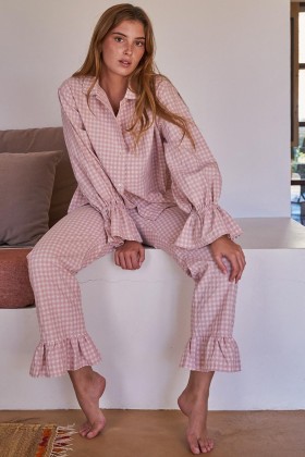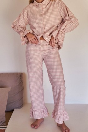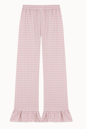 Pantalón de pijama con volantes en el bajo. Está confeccionado en tejido de cuadros en seersuker en tono rosa palo y crudo.  100% algodón. 100% hecho en España.