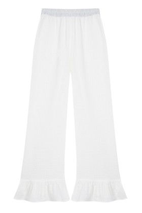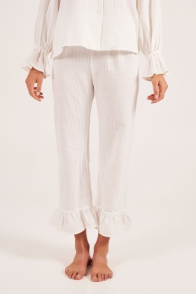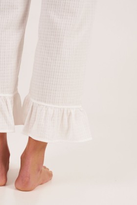 Pantalón Largo con Volantes de Color Blanco Pantalón de pijama largo con volantes, confeccionada con tejido blanco de seersuker. 100% algodón. 100% hecho en España.