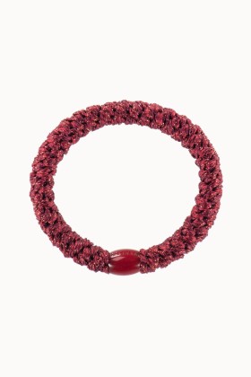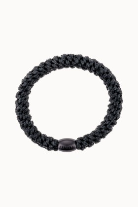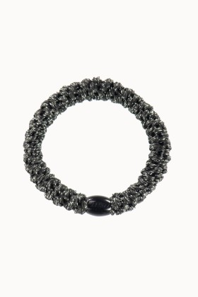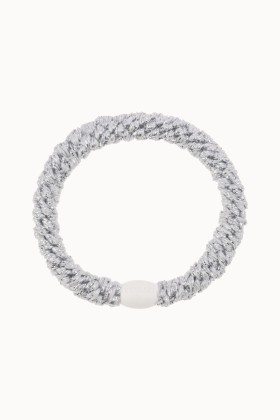 Una goma de pelo famosa por su técnica de tejido única, que la hace ideal para cualquier tipo de cabello. Son resistentes y cómodas, perfectas para recogidos o para llevar como pulsera. Descúbrela en plateado con glitter.