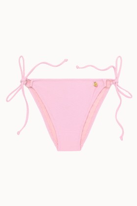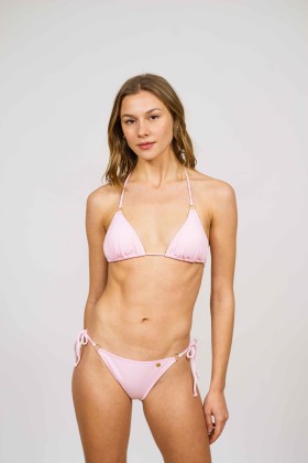Braguita de bikini brasileña que se ata por los laterales mediante un lazo regulable y que lleva dos aritos dorados de metal a cada lado. Tejido de piqué en color rosa clarito.