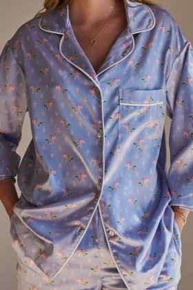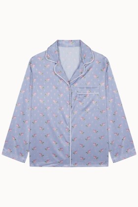 Camisa de pijama con bolsillo confeccionada en tejido satinado de color lavanda con un estampado floral en tonos crudos y rosas y ribete en crudo. Este modelo está 100% hecho en España.