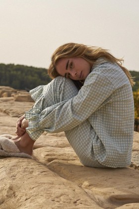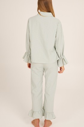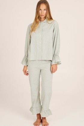 Pantalón de pijama con volantes en los tobillos. Está confeccionado con tejido de cuadros con seersuker en tono azul clarito y crudo. Un pijama super romántico que te acompañará en tus mejores sueños.