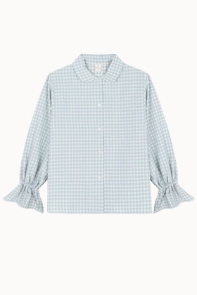 Camisa de pijama con volantes en los puños, confeccionada con tejido de cuadros de seersuker en tono azul clarito y crudo.  100% algodón. 100% hecho en España.