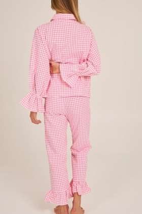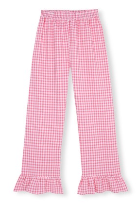 Pantalón de pijama largo con volantes, confeccionada con tejido de cuadros de seersuker en tono rosa y blanco.  100% algodón. 100% hecho en España.