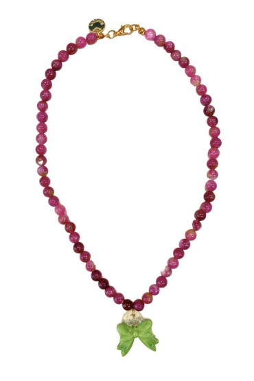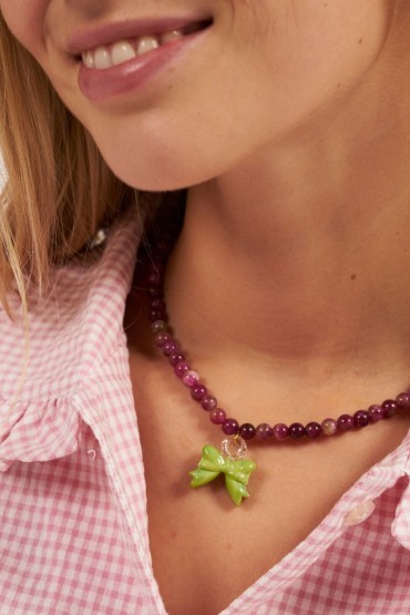 Collier de Perles Bordeaux avec Nœud Vert Romantique, spécial et féminin. Collier avec perles en pierre bordeaux et breloque en forme de nœud en verre soufflé vert. Fabriqué avec amour à Barcelone.