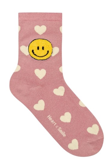Chaussettes en Rose avec des Cœurs Beiges et Smile Ajoutez une touche d'humour à votre journée avec les chaussettes Smile. Un motif rose avec un sourire jaune et des cœurs beiges.