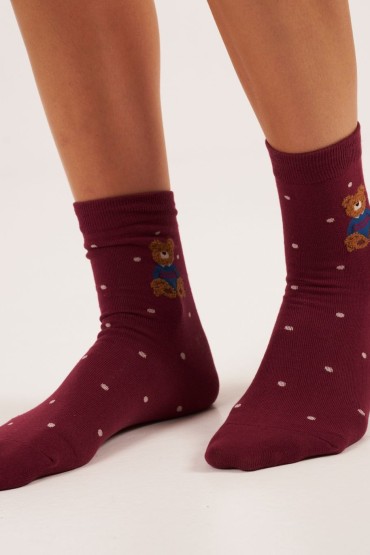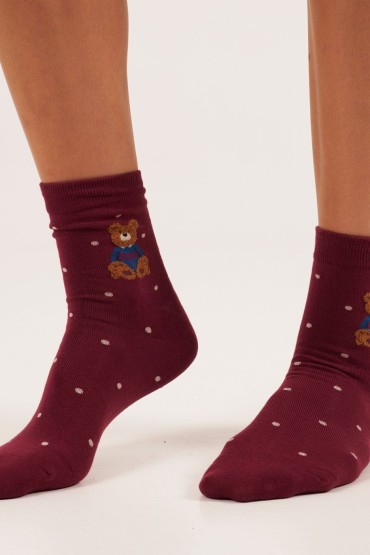 Chaussettes Bordeaux à Pois Beiges et Oursons La touche la plus spéciale à votre look cette saison : les chaussettes Teddy. Un modèle bordeaux avec des pois beiges et un ourson des deux côtés.