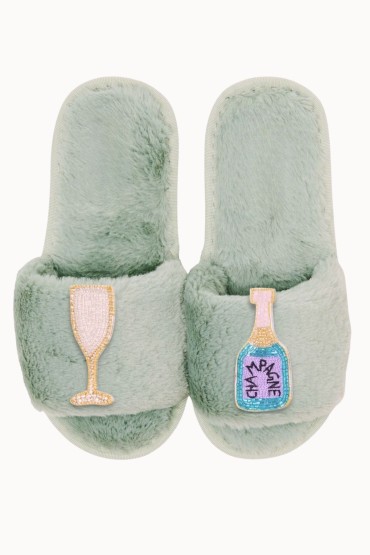 Chaussons avec Broche en Vert Menthe Craquez pour notre nouvelle chaussons effet fourrure dans ce magnifique vert menthe. Le détail de la broche en verre et le Champagne en font une pièce unique pour votre garde-robe.