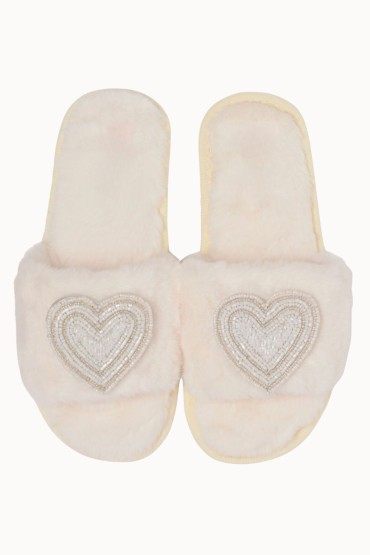 Chaussons Ecru Effet Fourrure avec Broche Coeur Confortable, chaleureux et avec le détail du cœur. Les nouvelles baskets en fausse fourrure de couleur écru sont tout ce dont vos pieds ont besoin cette saison. Une...