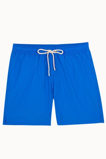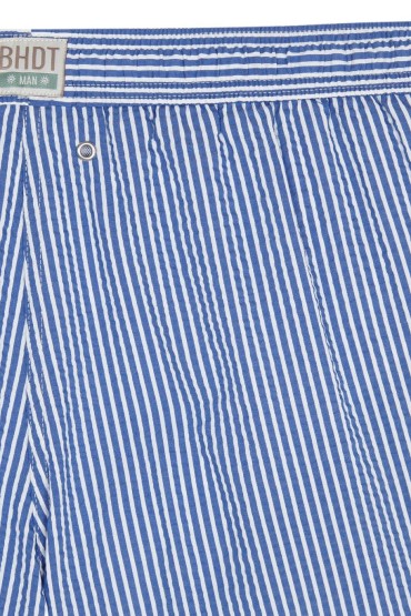 Maillot de bain pour homme en polyamide. Tissu seersucker à rayures bleues et écrues.
