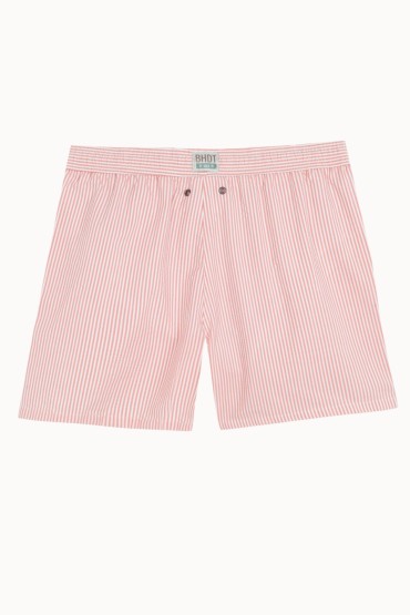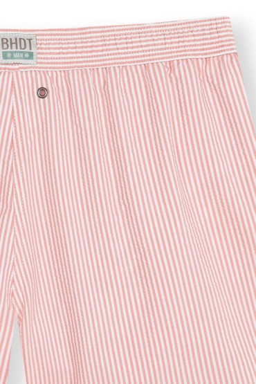 Maillot de Bain Homme à Rayures Roses et Blanches Maillot de bain pour homme en tissu seersucker à rayures roses et blanches. Doté d’une ceinture élastique et d’un cordon de serrage ajustable. 100% Fabriqué à Barcelone.