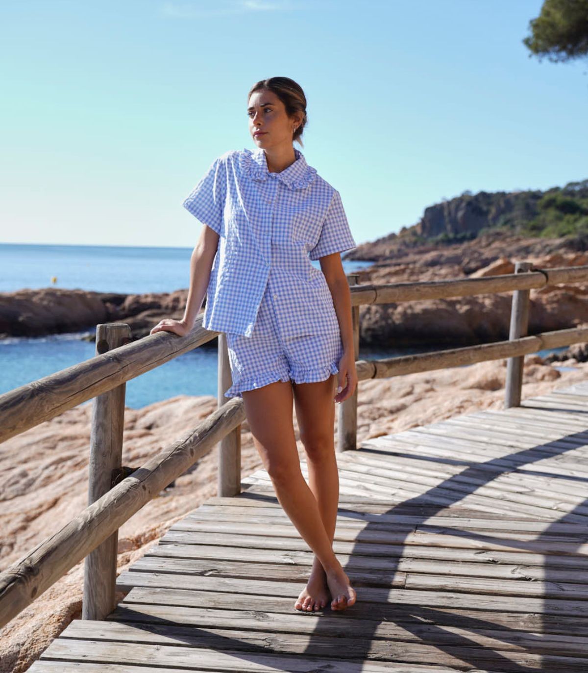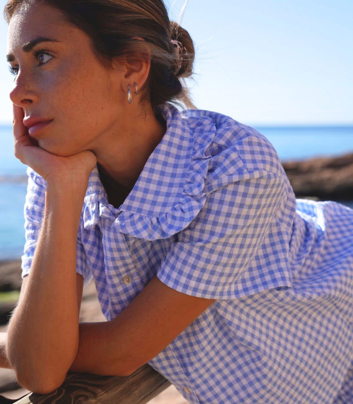 Pyjama shirt with ruffles on the neck, made with seersuker plaid fabric in blue and white.