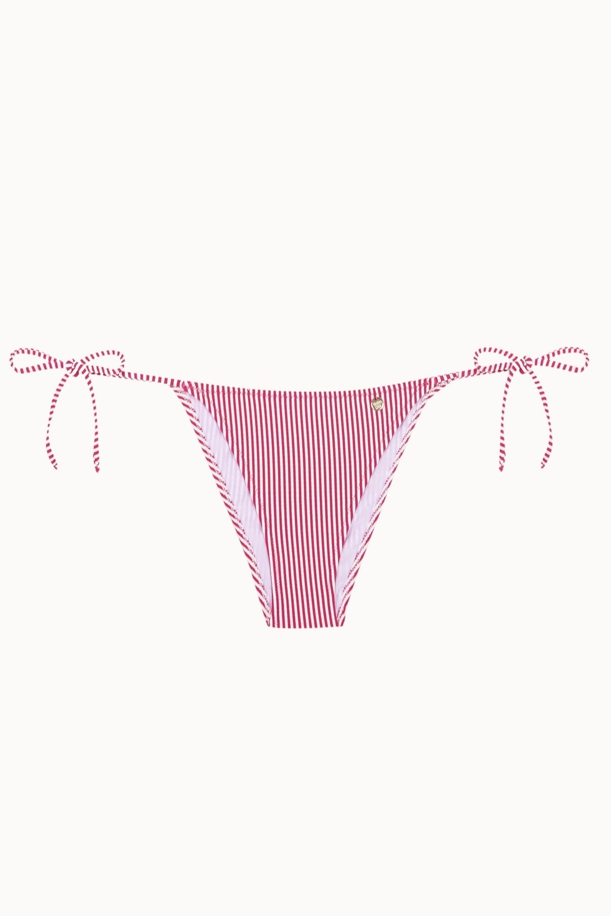 Avec une laçade latérale pour s'ajuster parfaitement à votre corps et un tissu seersuker à rayures verticales crues et fuchsia, nous présentons la Cerise Bottom Tie. Son style semi-brésilien et ses laçades en font une culotte de bikini très polyvalente.