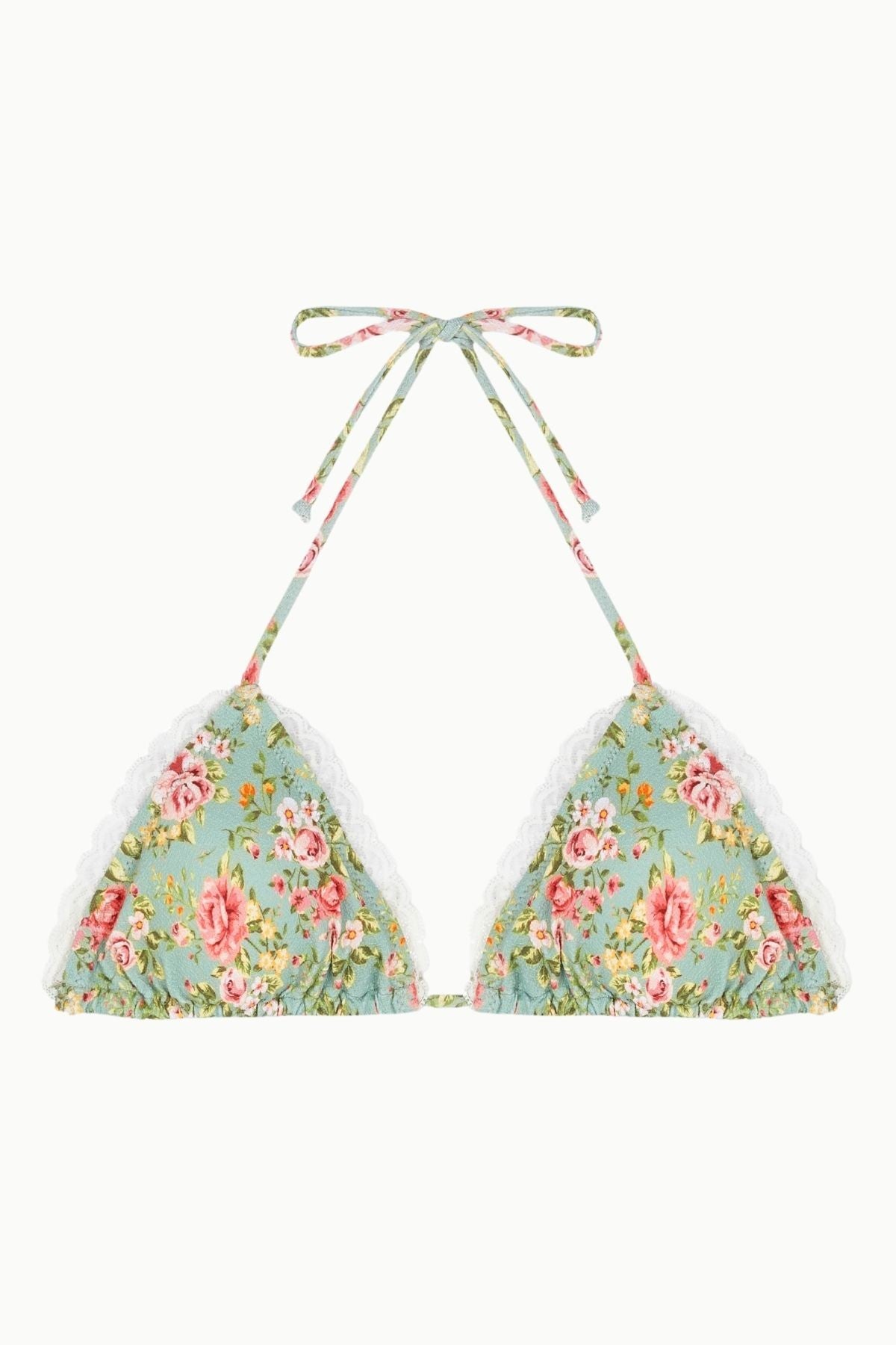 Haut de Bikini Imprimé Fleuri sur Fond Vert Mousse avec Dentelle