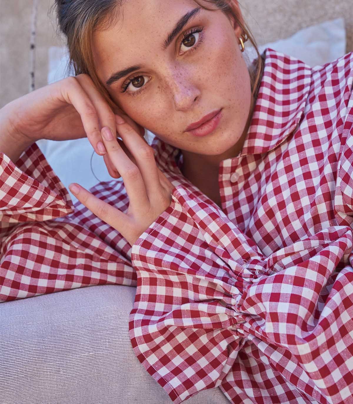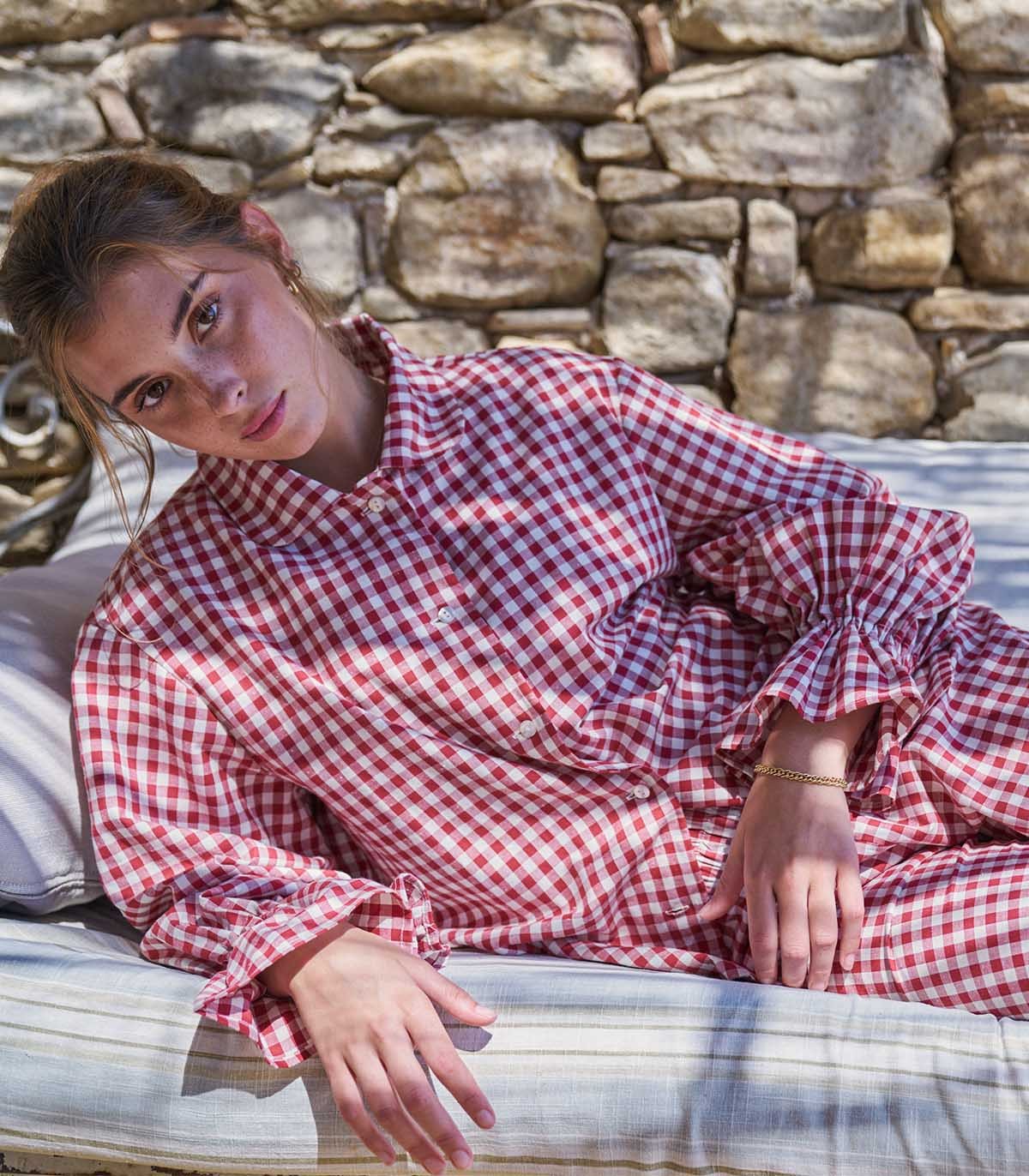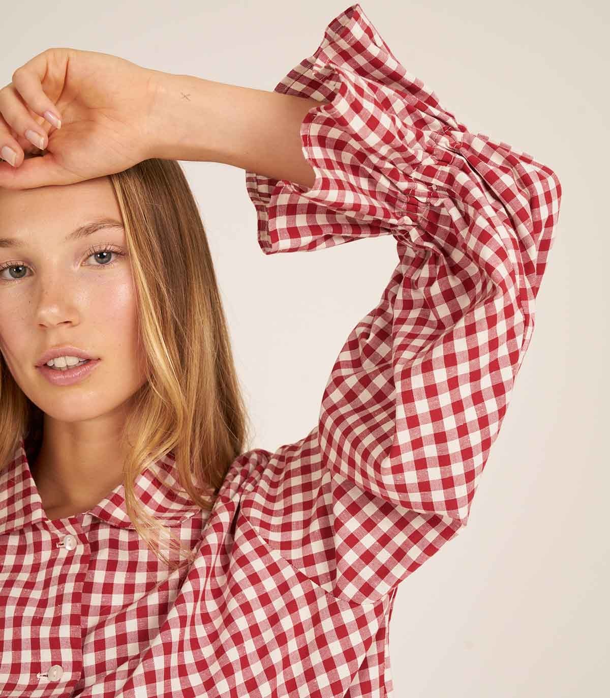 Chemise de pyjama à volants aux poignets, confectionnée dans un tissu à carreaux de coton aux tons rouge et crème.