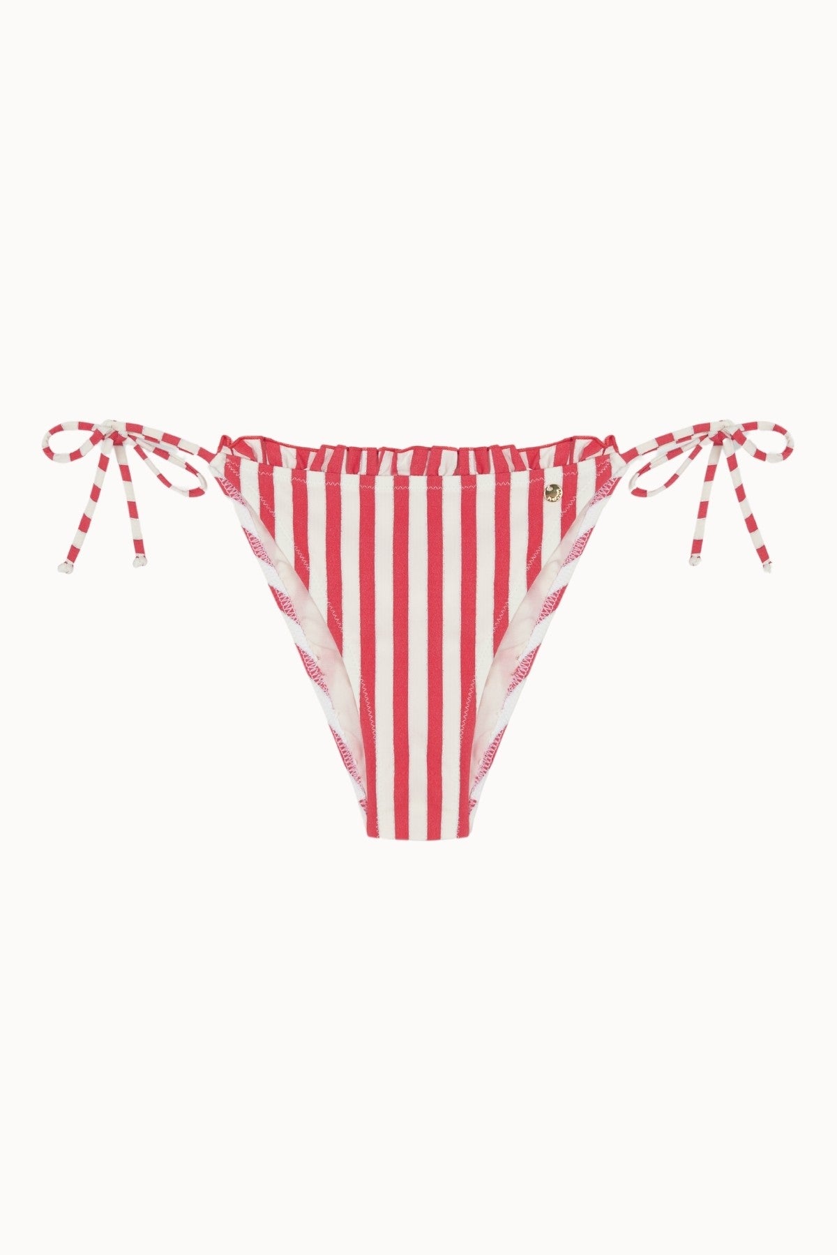 Couverture moyenne, ajustable grâce aux liens latéraux et avec le détail des volants. Le Crabe Bottom Tie Vol est fabriqué dans un tissu rayé rouge et crème avec un fil de lurex argenté.