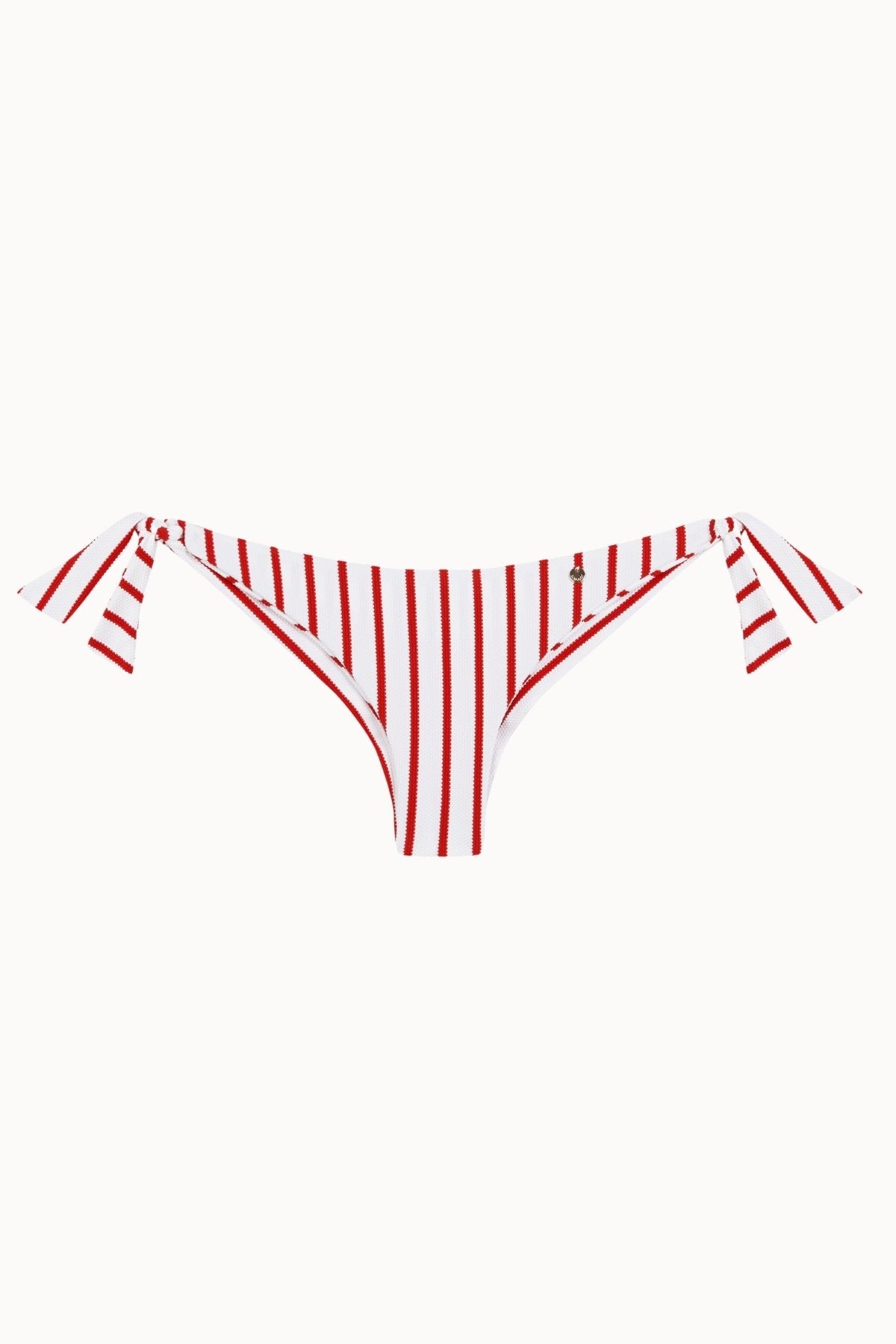 La Elle Bras Sun est une culotte brésilienne taille basse avec liens latéraux et un dos très flatteur. Son tissu piqué recyclé à rayures rouges et blanches apporte une touche sensuelle dans un esprit chic et marin.