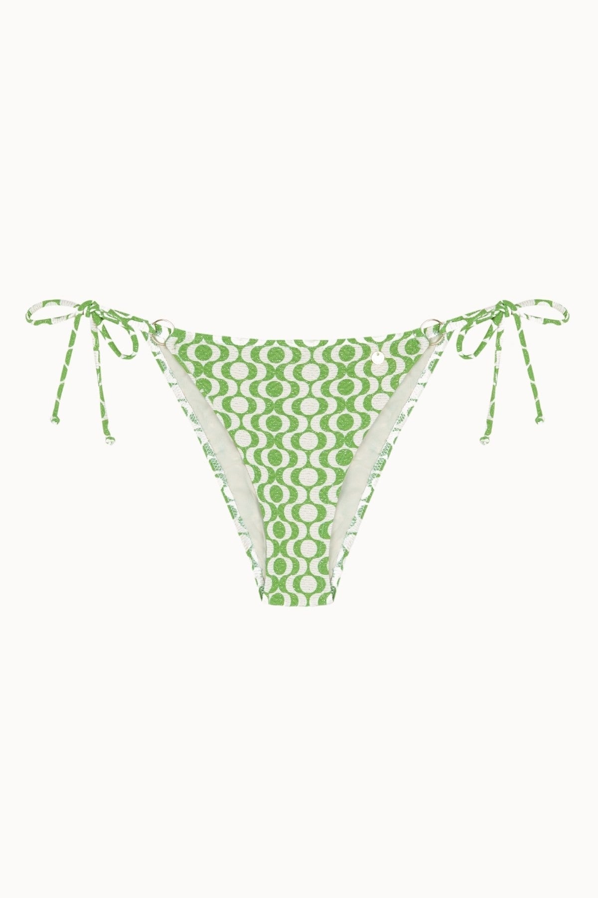 Avec une texture lurex argentée et un imprimé géométrique d’inspiration rétro, le Lea Bottom Aro offre une couverture échancrée et des liens latéraux ajustables. Les anneaux dorés sur les côtés ajoutent une touche sophistiquée tout en assurant un ajustement parfait.