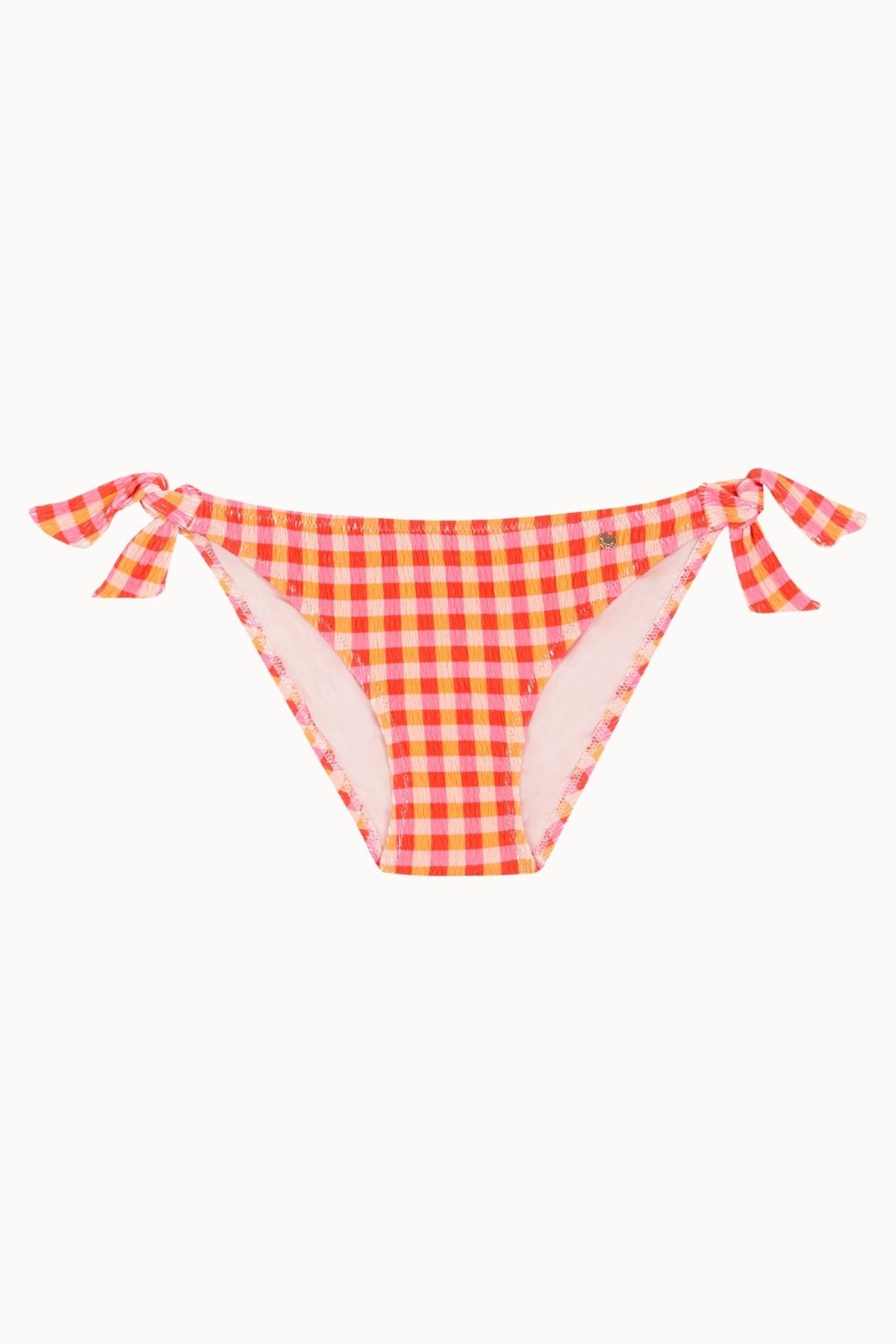 La Lucy Bottom B/N est une culotte de coupe classique avec liens latéraux pour un ajustement confortable. Son tissu effet smock à carreaux rose fluo et orange apporte une touche moderne, lumineuse et pleine de vitalité.