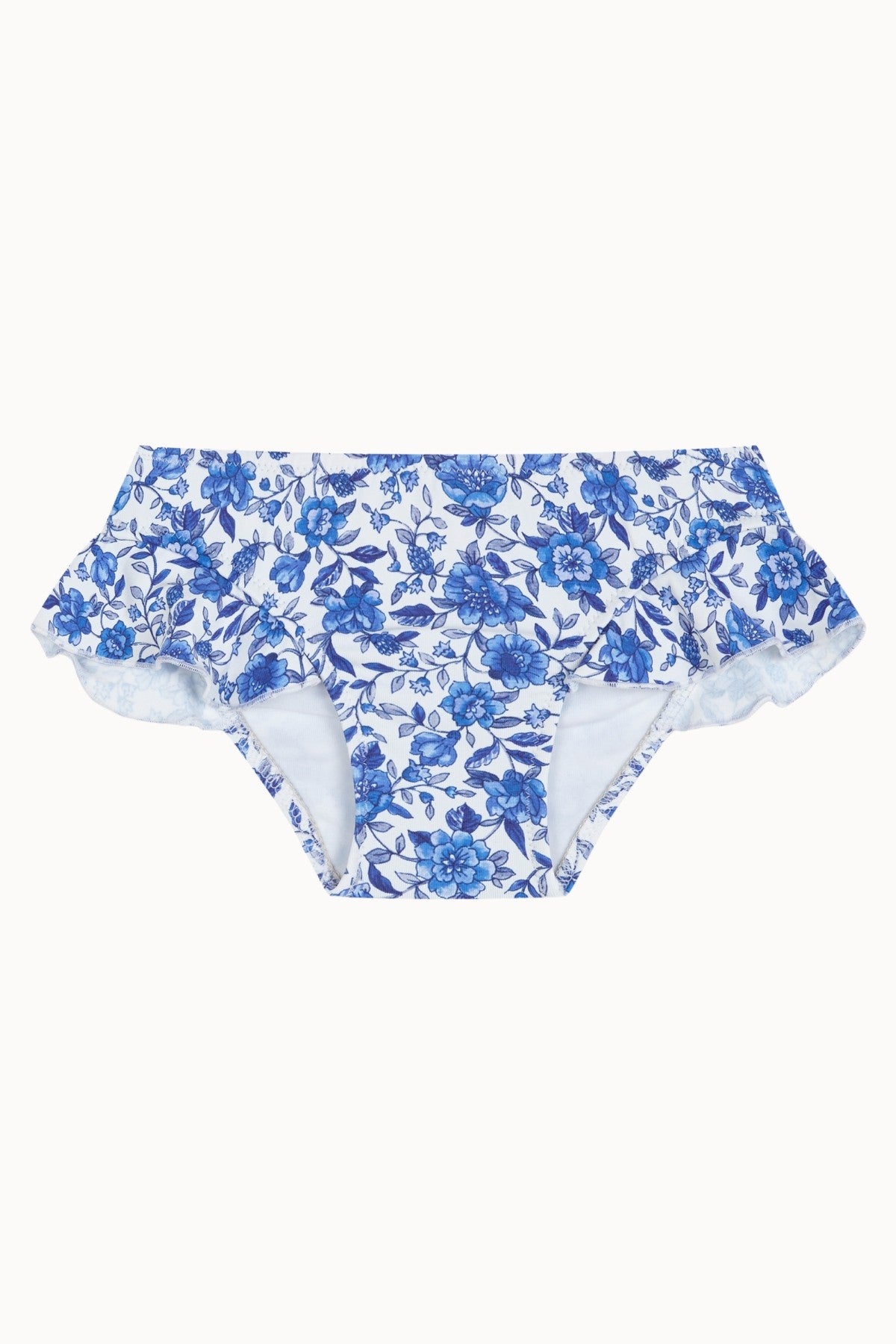 Bas de bikini fille avec volant et dos froncé, confectionné dans un imprimé fleuri dans des tons bleus. Disponible dans un design assorti pour femme.