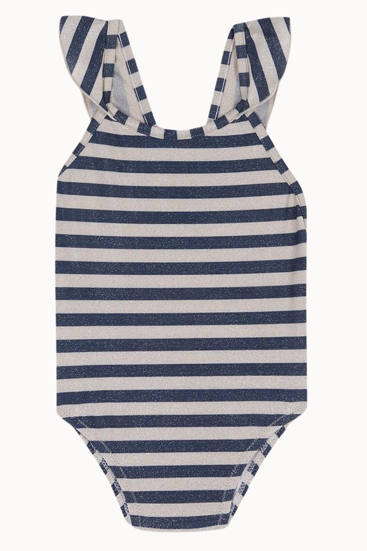 Maillot de bain pour fille avec dos croisé et volants sur les bretelles. Tissu lurex doré avec des rayures bleu marine.