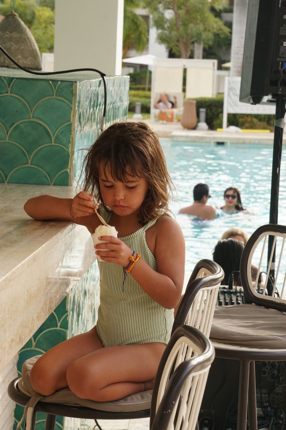Maillot de bain fille avec dos croisé et bretelles volantées. Avec des rayures vertes et écrues en tissu seersucker. Disponible dans un design assorti pour femme.