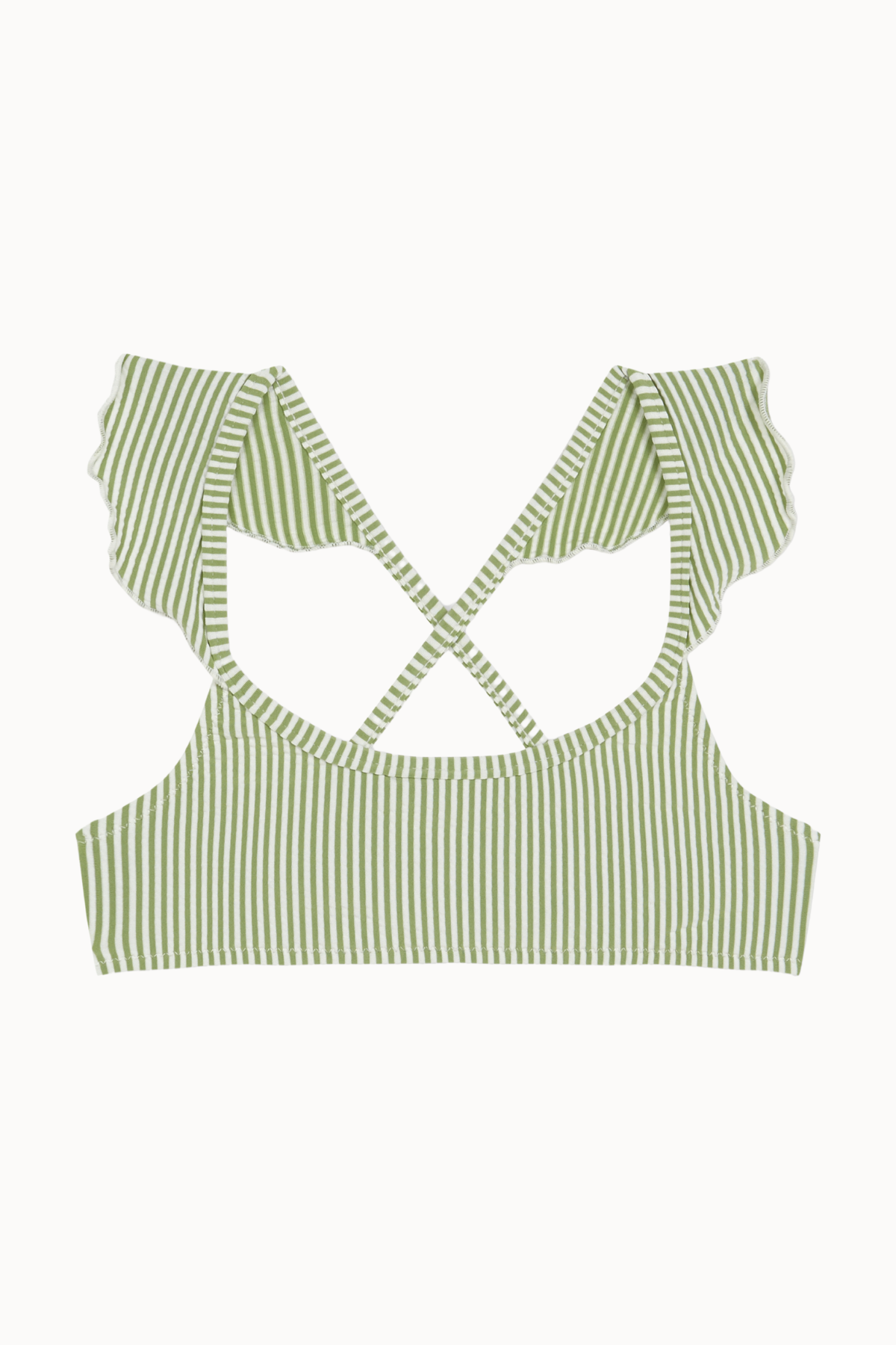Top fille à bretelles volantées, confectionné en tissu seersucker 100% recyclé à rayures vertes et écrues. Disponible dans un design assorti pour femme.