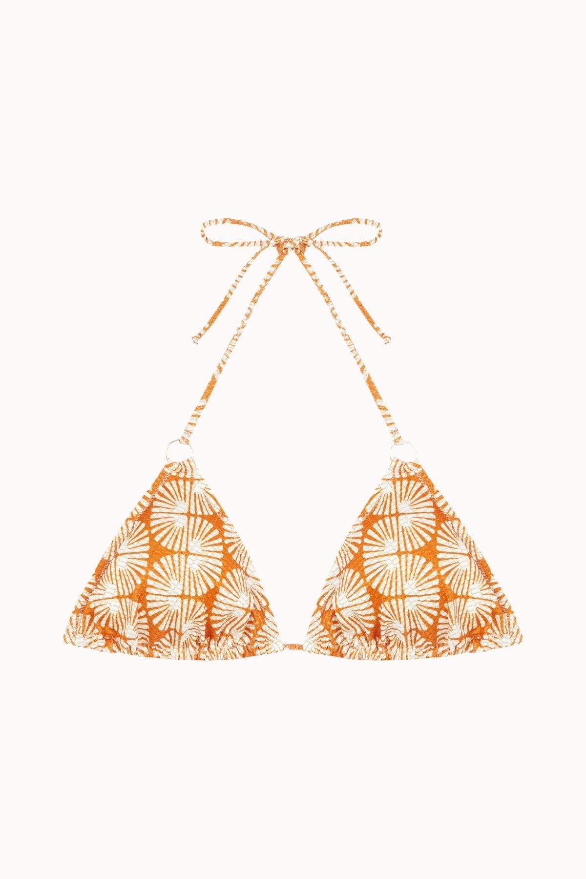 Le Ondine Top Triangle Aros présente des bonnets triangulaires avec coques amovibles et deux petits anneaux dorés sur les bretelles pour une touche bijou délicate. Son tissu lurex structuré à imprimé géométrique ambre et écru apporte une brillance subtile et une texture raffinée, pour un look de plage élégant et flatteur.