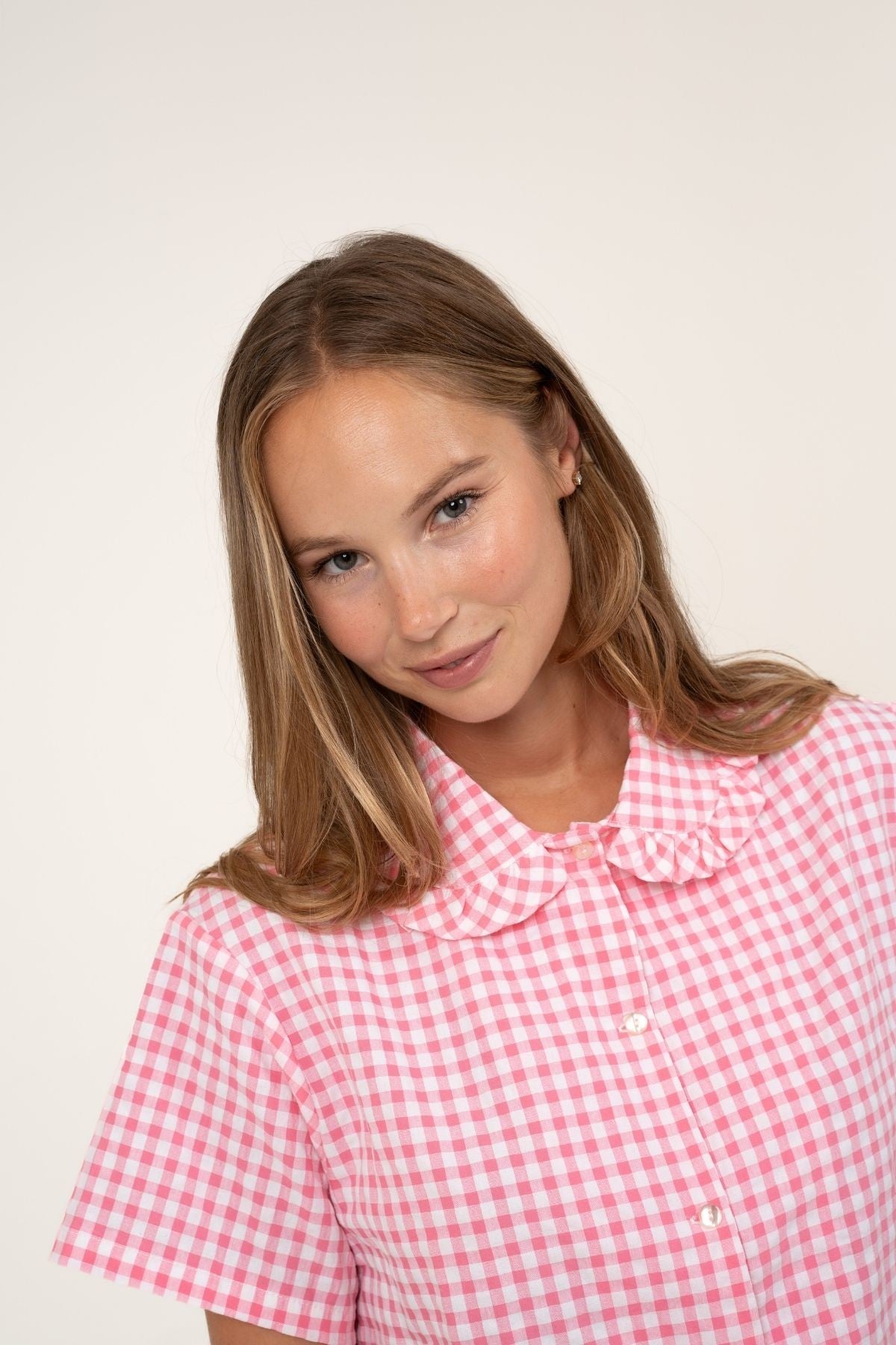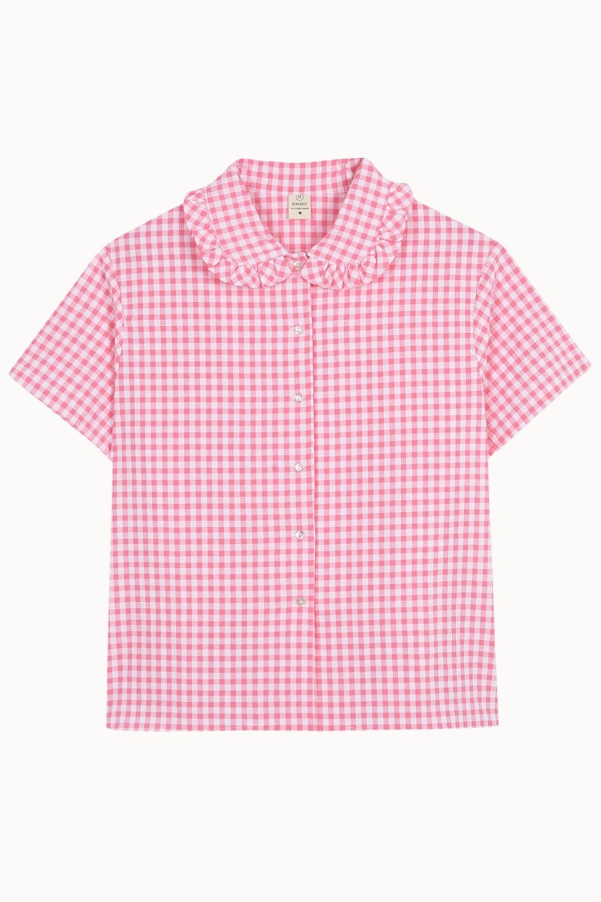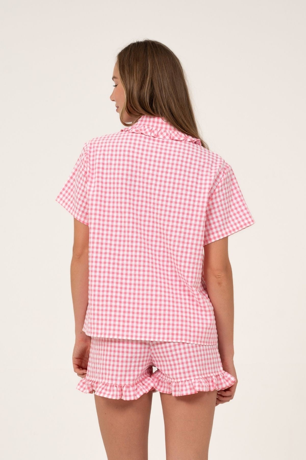 Pyjama shirt with ruffles on the neck, made with seersuker plaid fabric in pink and white.