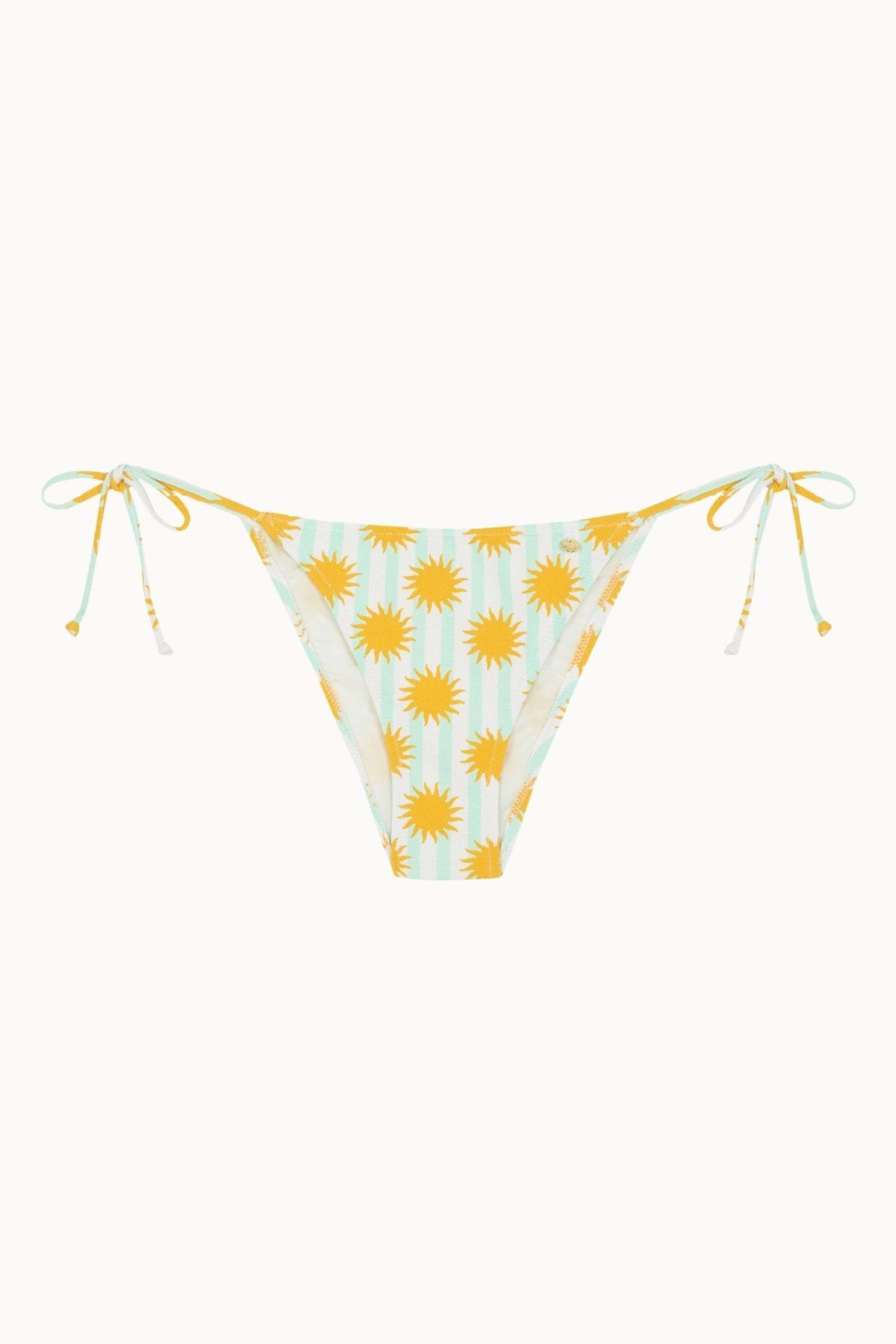 La Sole Bottom Tie est une culotte de bikini semi-brésilienne avec liens latéraux réglables pour un ajustement personnalisé. Son tissu crêpe imprimé de soleils jaunes et de rayures vert d’eau offre un rendu léger, frais et flatteur.