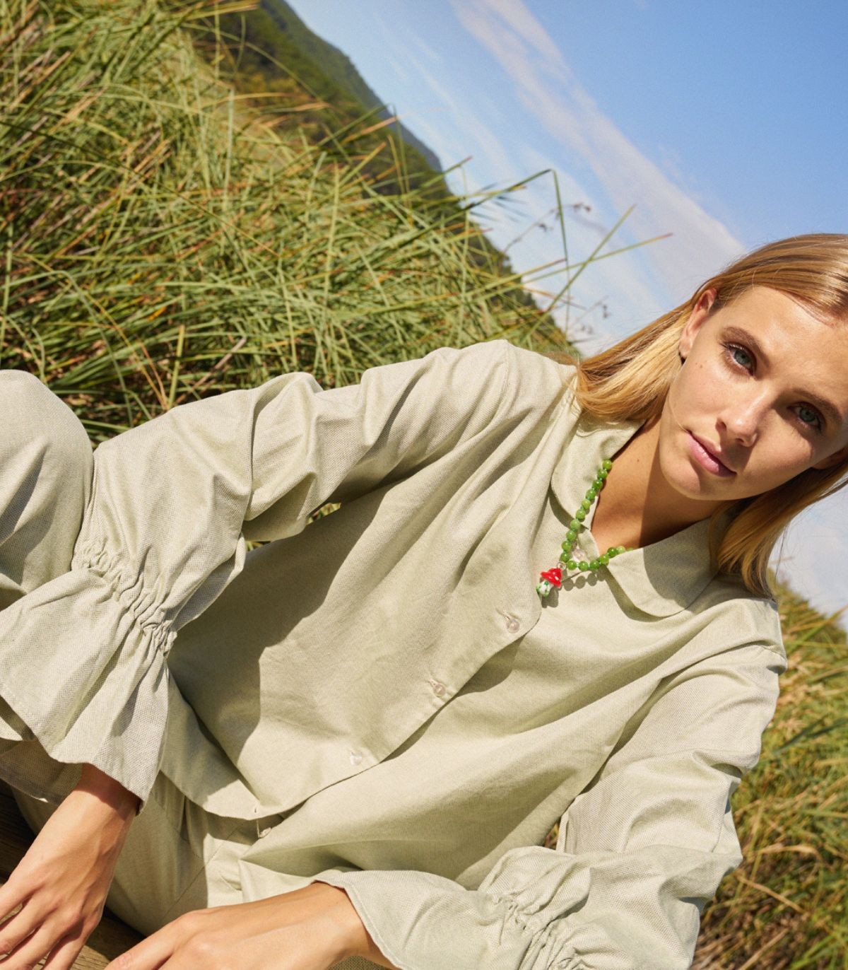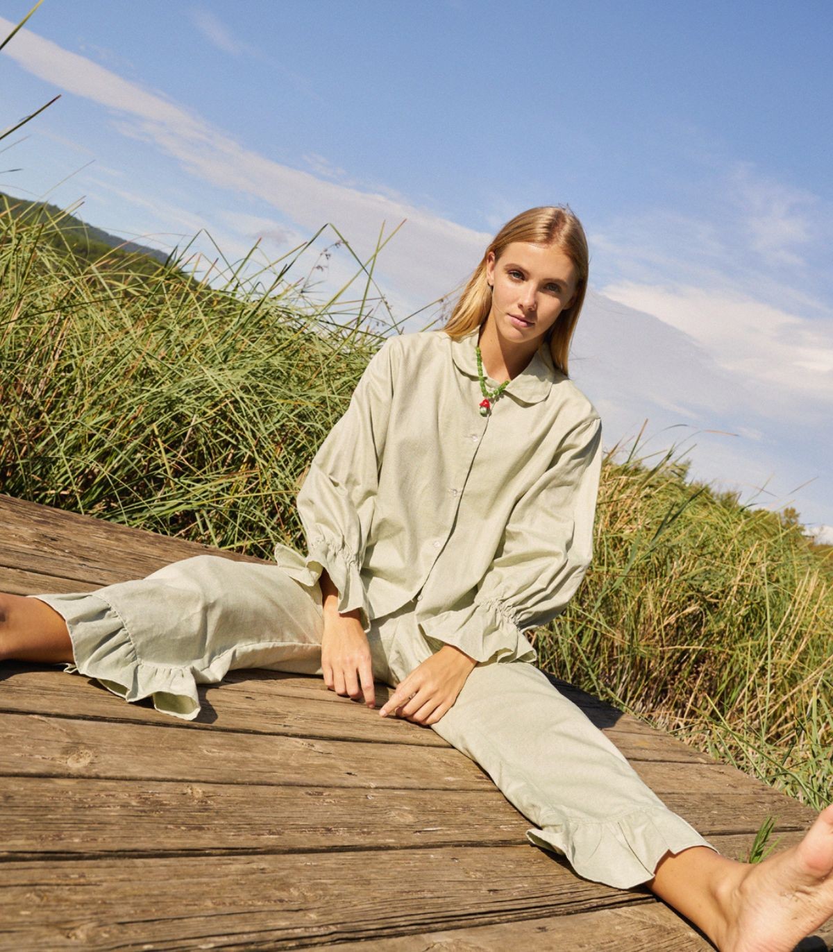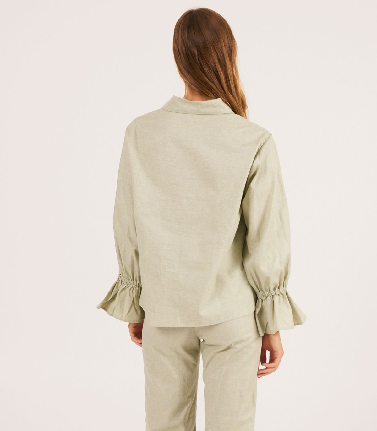 Si buscas una camisa lisa con un toque especial, te encantará el modelo Mist. Una camisa con volantes en los puños, confeccionada con tejido de algodón tipo canvas en verde claro y los botones nacarados.