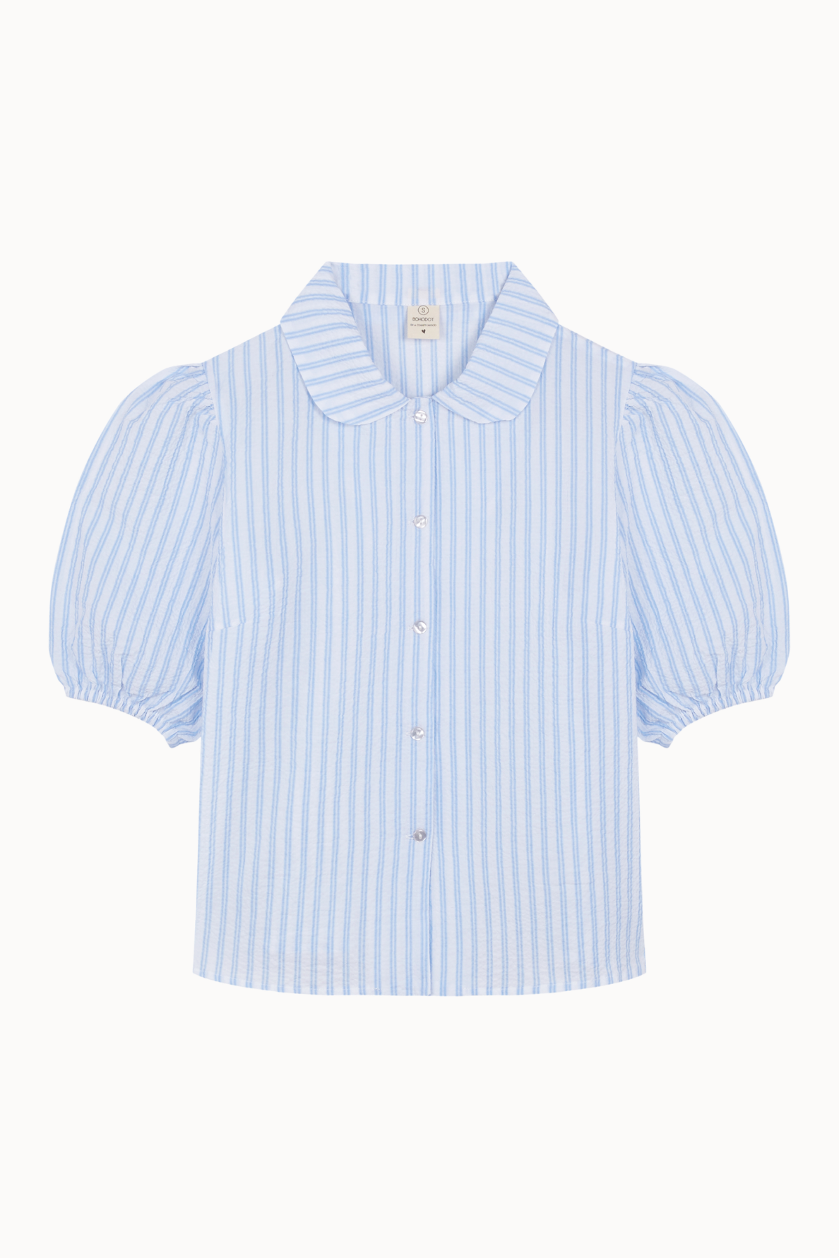 Una camisa de rayas verticales en azul y blanco con un aire fresco, vibrante y de inspiración mediterránea. Esta camisa de manga corta con mangas abullonadas incorpora un cierre frontal con botones que aporta versatilidad y funcionalidad a la prenda.