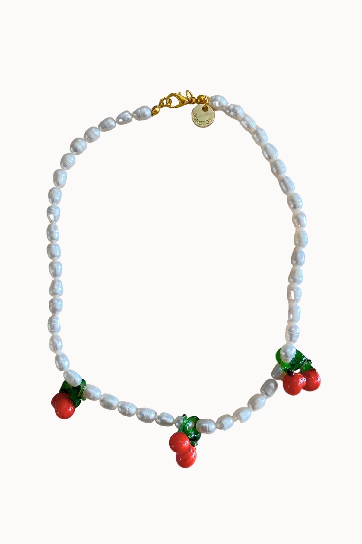 El complemento perfecto para el día a día, el collar Mini Cherry. Un diseño hecho con perlas de río y tres charms de cerezas en cristal soplado. Hecho a mano en España.