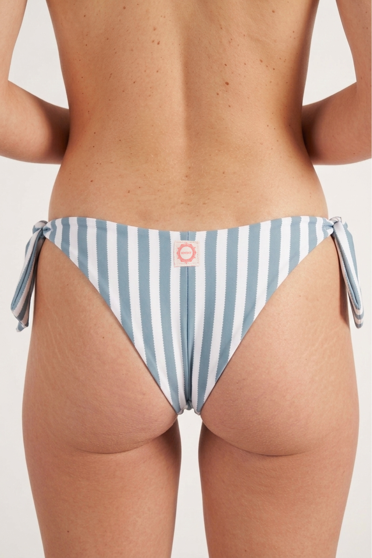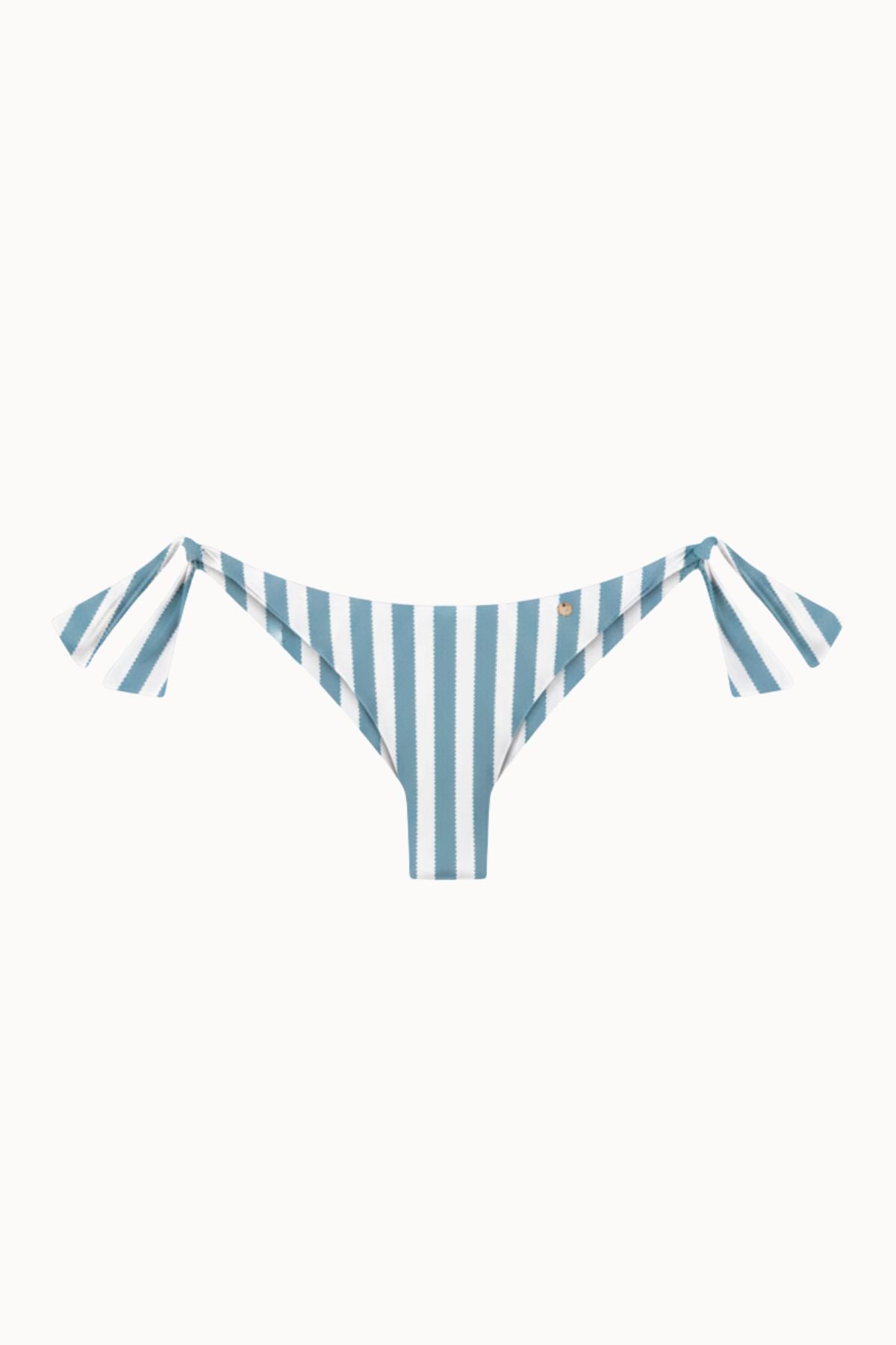 La Lisa Bras Sun es una braguita brasileña de tiro bajo con lazadas laterales y un partido trasero muy favorecedor. Su estampado de rayas onduladas en tonos azulados y crudos aporta un look fresco, femenino y veraniego.