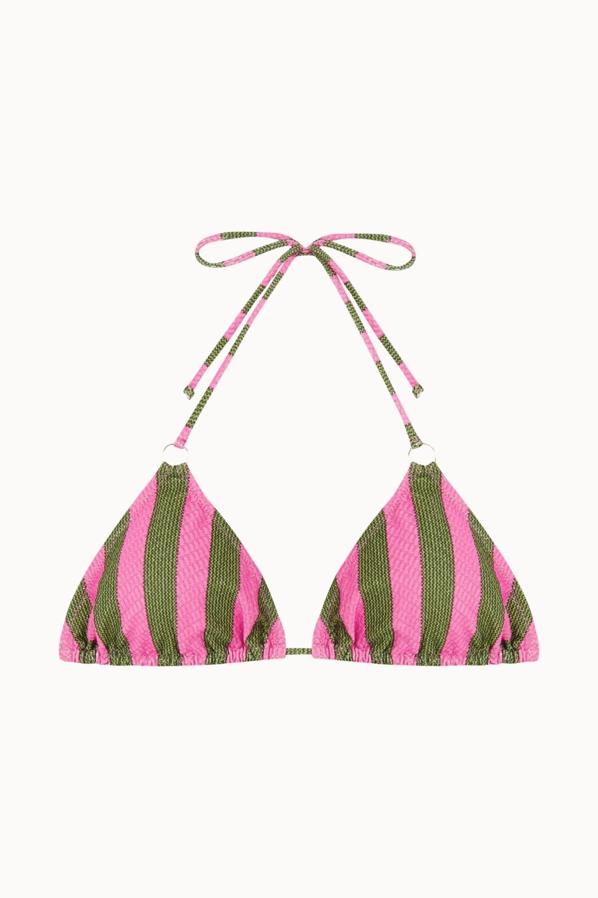 Top de Bikini Triángulo con Aros Dorados en Rayas Rosa y Verde con Lúrex Dorado