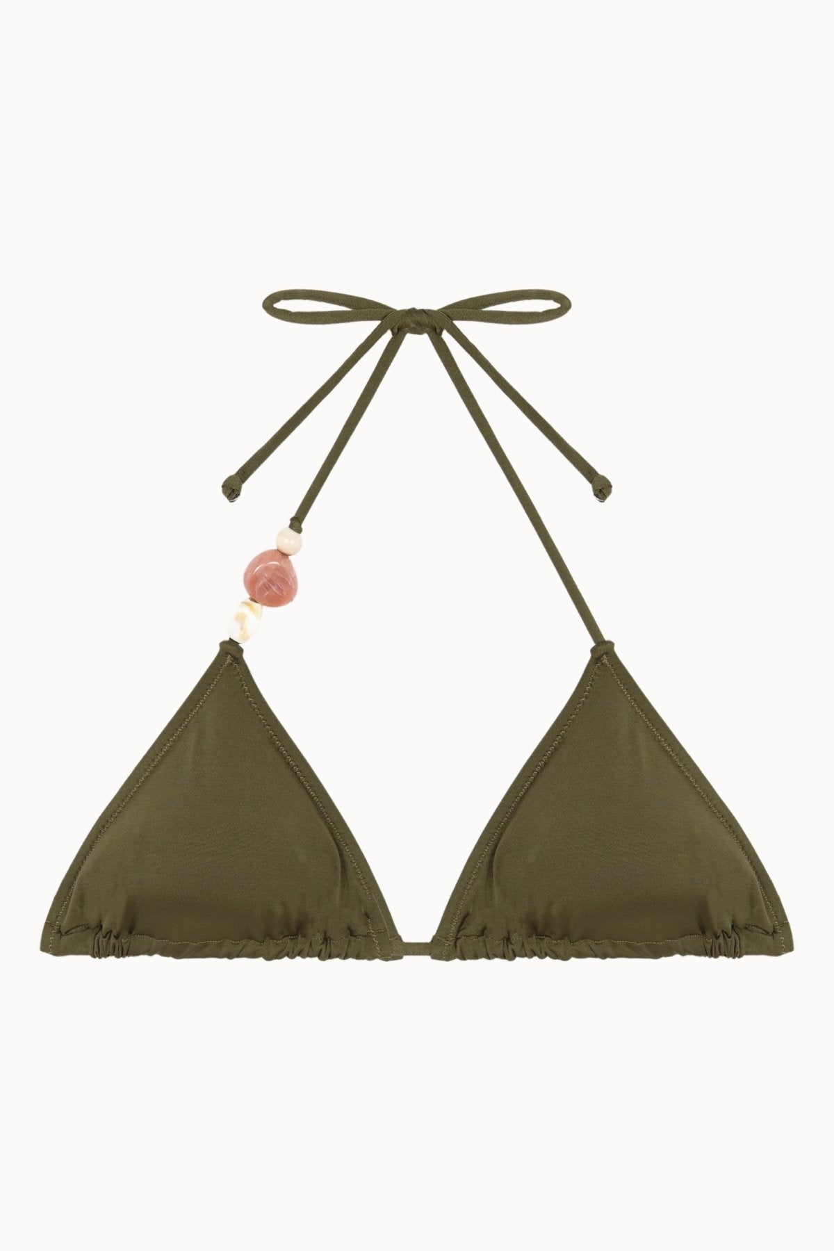 El Olivia Top Triángulo Bol es una parte de arriba de bikini con copas triangulares y rellenos extraíbles para un ajuste natural. Incorpora dos bolas decorativas en tonos rosa y crudo en uno de los tirantes que aportan un toque artesanal y sofisticado. Confeccionado en tejido satinado verde kaki de brillo sutil y tacto suave, es ideal para un look elegante y veraniego. Combínalo con la Olivia Bottom Tie Bol para un conjunto perfecto.