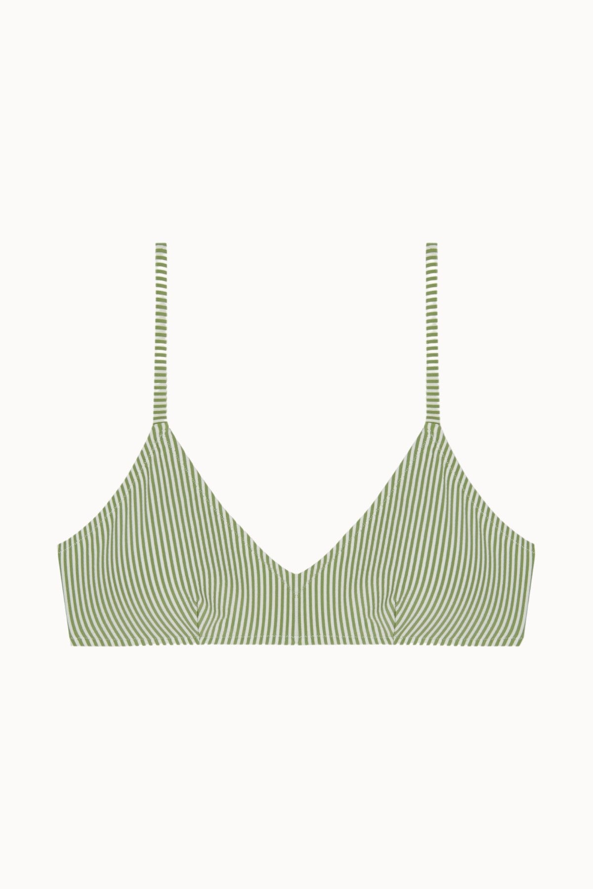 Una raya verde y cruda en tejido de seersuker es la protagonista en el Rosemary Top Aura. Un top de bikini de estilo deportivo con escote en "V", con reguladores en los tirantes y cierre multiposición para una mayor comodidad.
