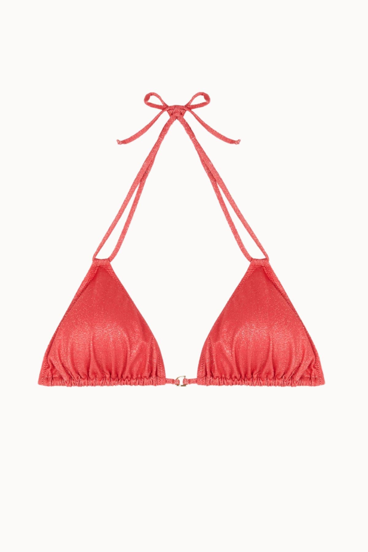 Descubre el nuevo Rouge Top Tr, en tejido de lúrex rojo. Un top de bikini de triángulo con doble cinta al cuello y el detalle de la fornitura dorada en el centro. Combínalo con la Rouge Bottom Rid para el total look.