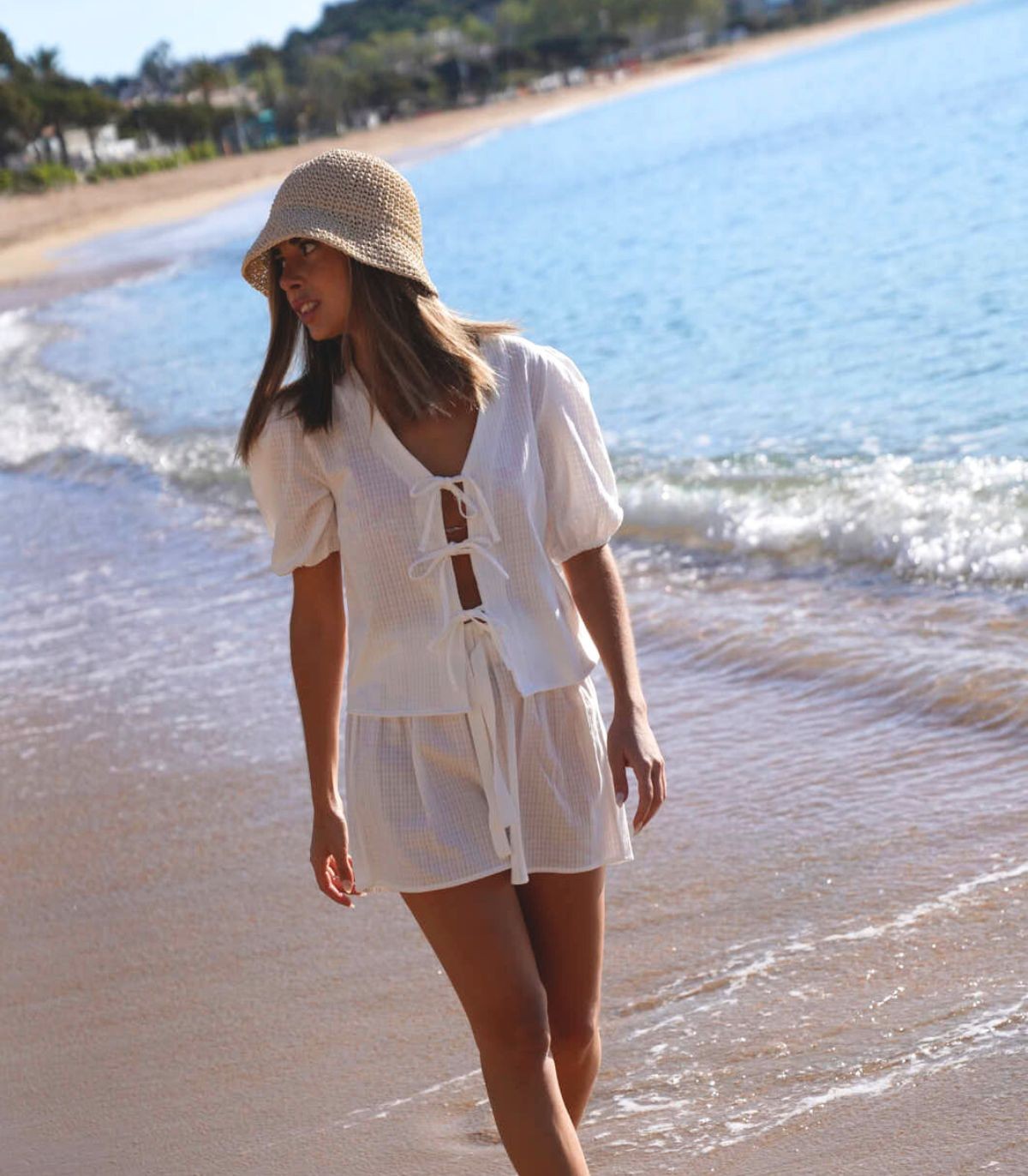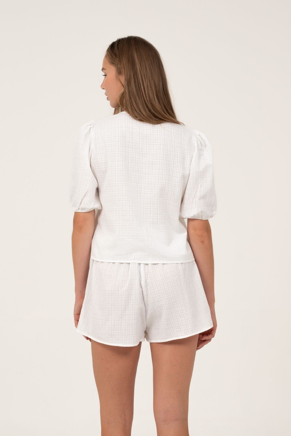 Pantalón de pijama corto con lazo, confeccionado con tejido de seersuker en color blanco.