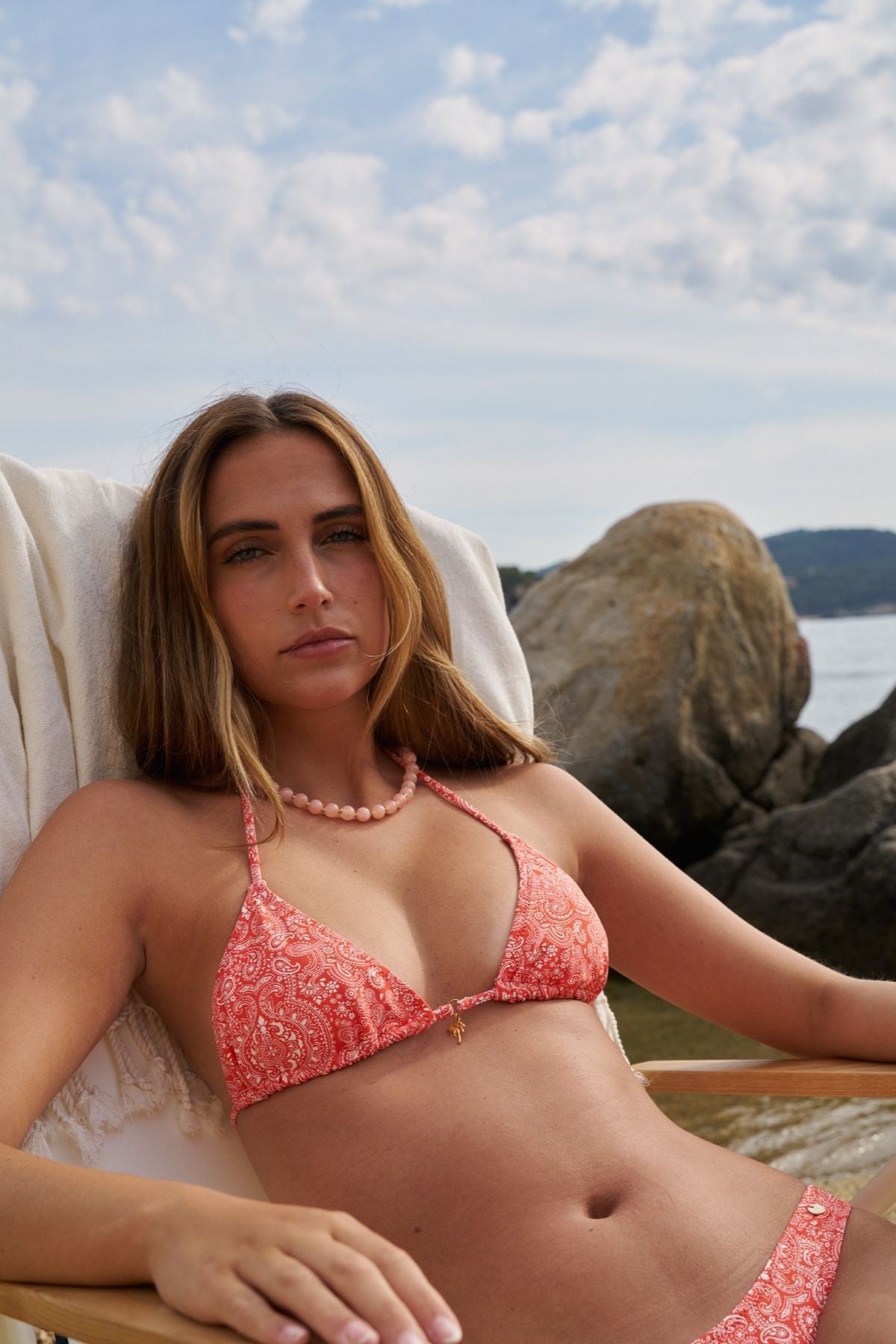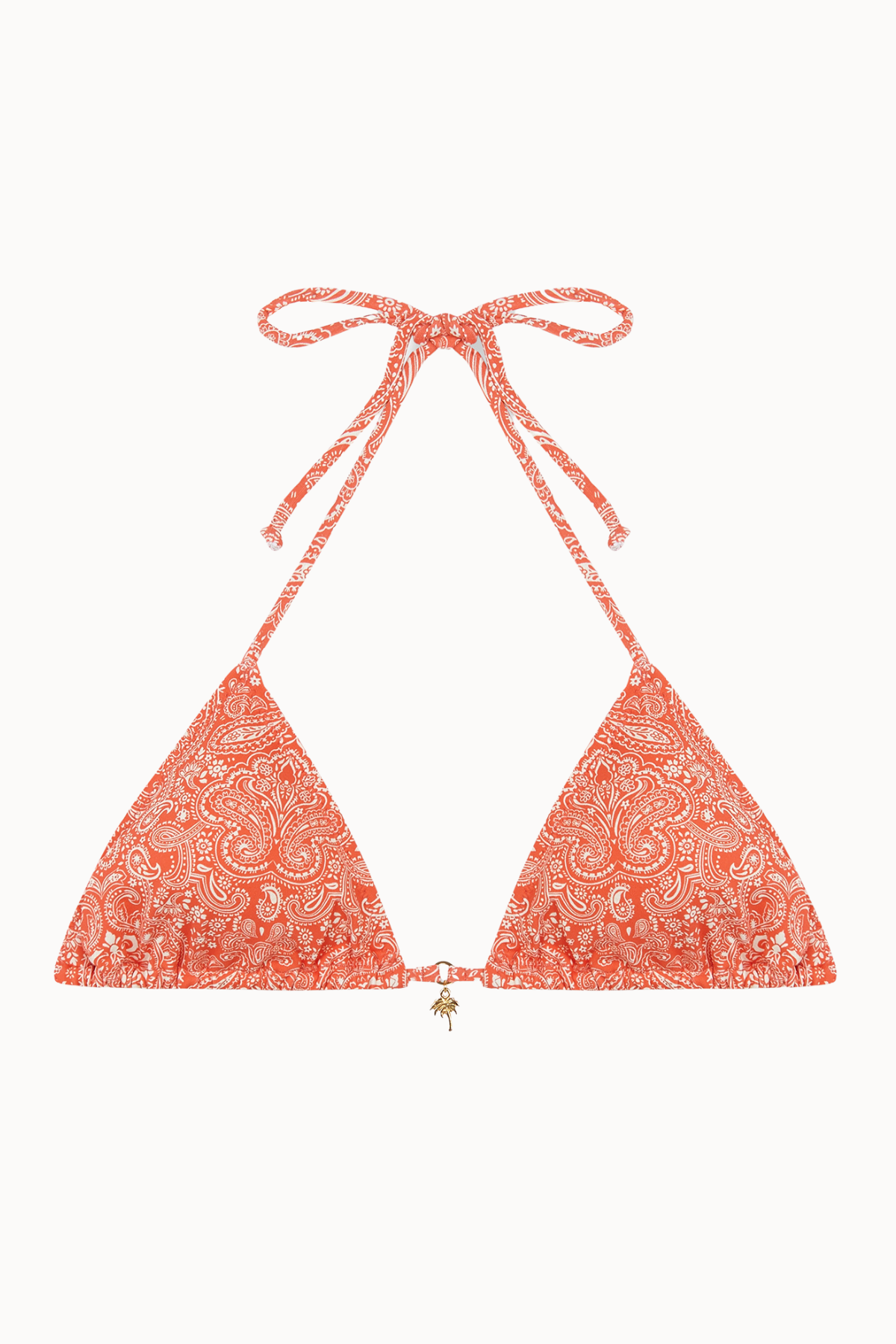 Top de Bikini Triángulo con Estampado de Cashmeres en Fondo Naranja y Charm de Palmera