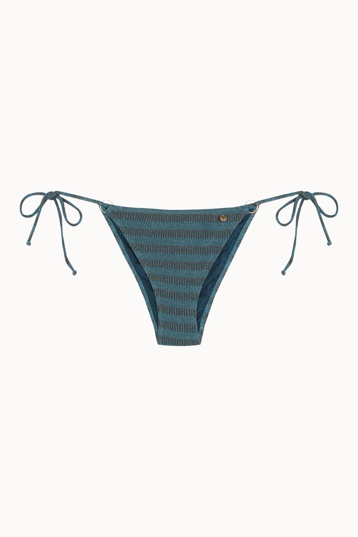 La Sirene Bottom Aro es una braguita semibrasileña con lazadas laterales ajustables y dos aritos dorados que realzan el diseño. Su cobertura media y su corte favorecedor estilizan la silueta. El tejido de lúrex jacquard en tonos azules y dorados añade un acabado luminoso y elegante.